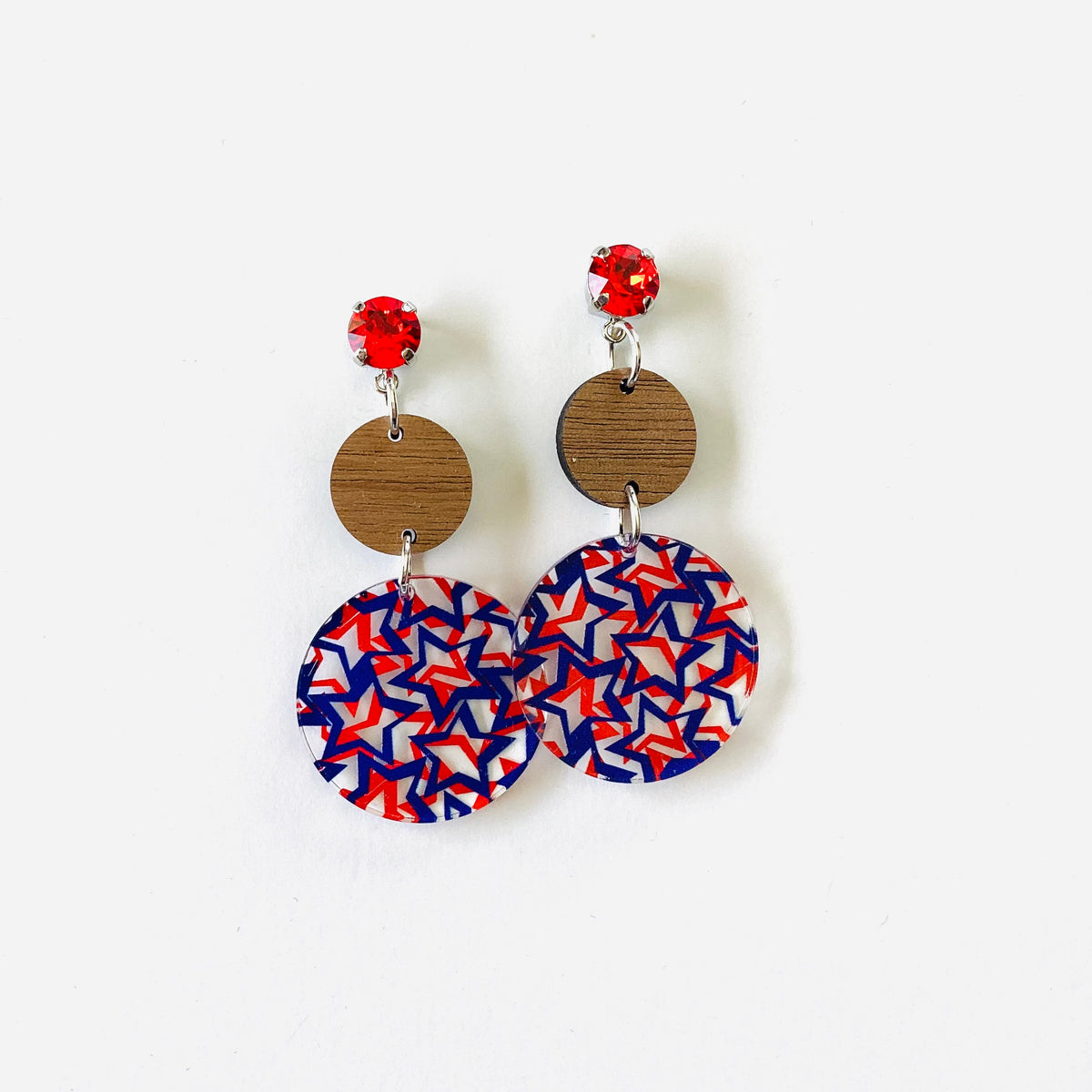 Red + Blue Star Earrings set into Shiny Silver Metal with Light Siam Crystals.