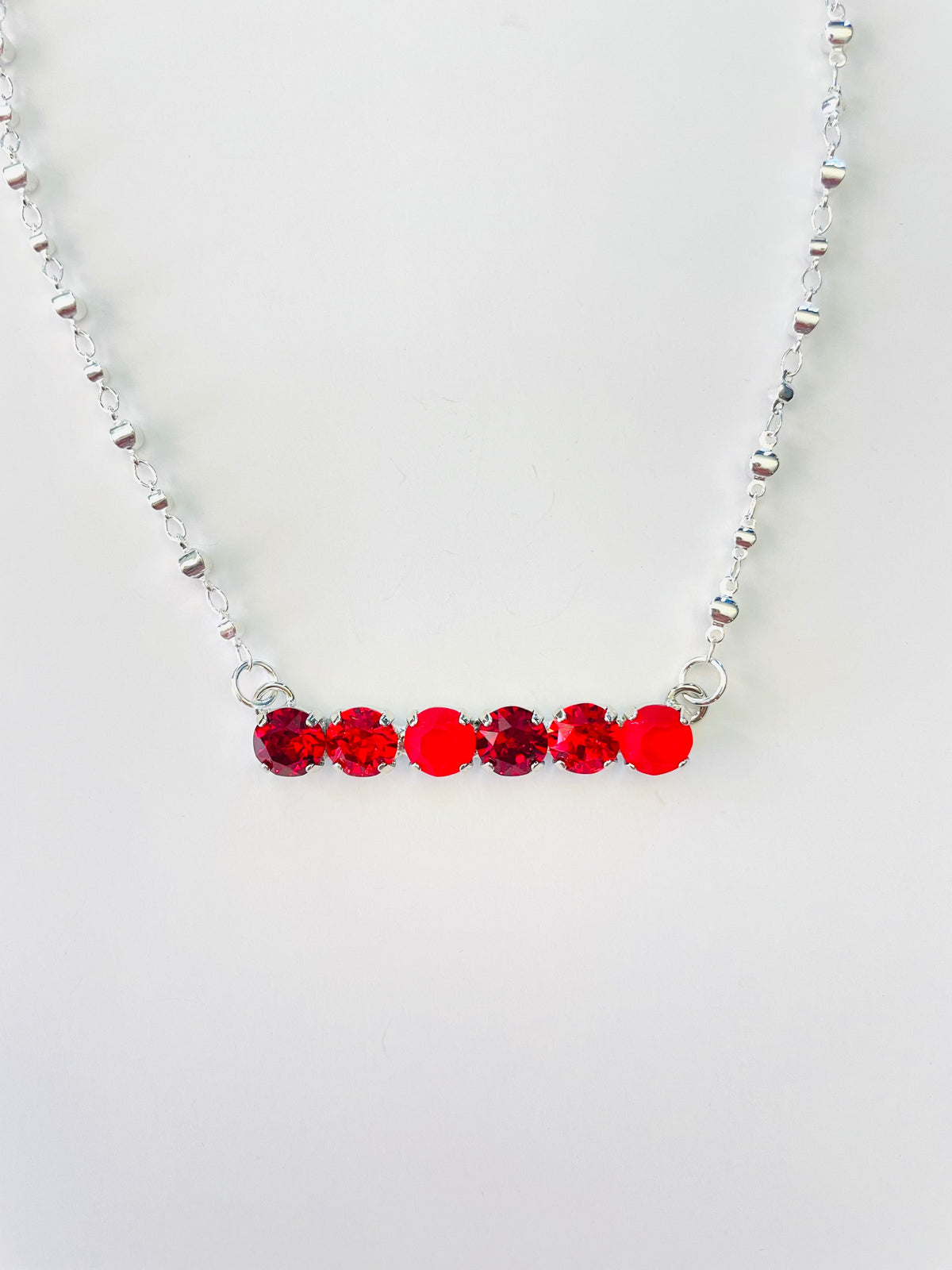Red Hot Bar Necklace set into Silver Plated Metal with Light Siam Matte, Light Siam, and Siam Crystals.