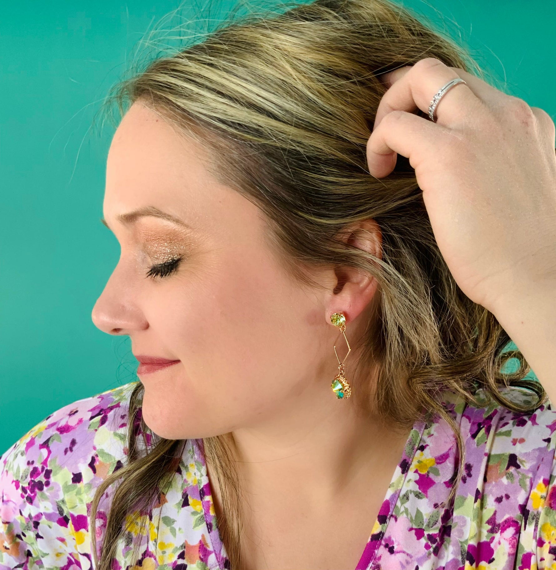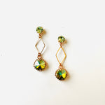 Rose Gold Peridot Drop Earrings set into Rose Gold Metal with Peridot Shimmer Crystals