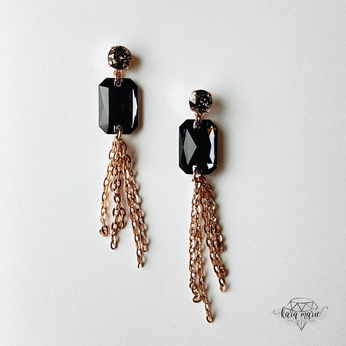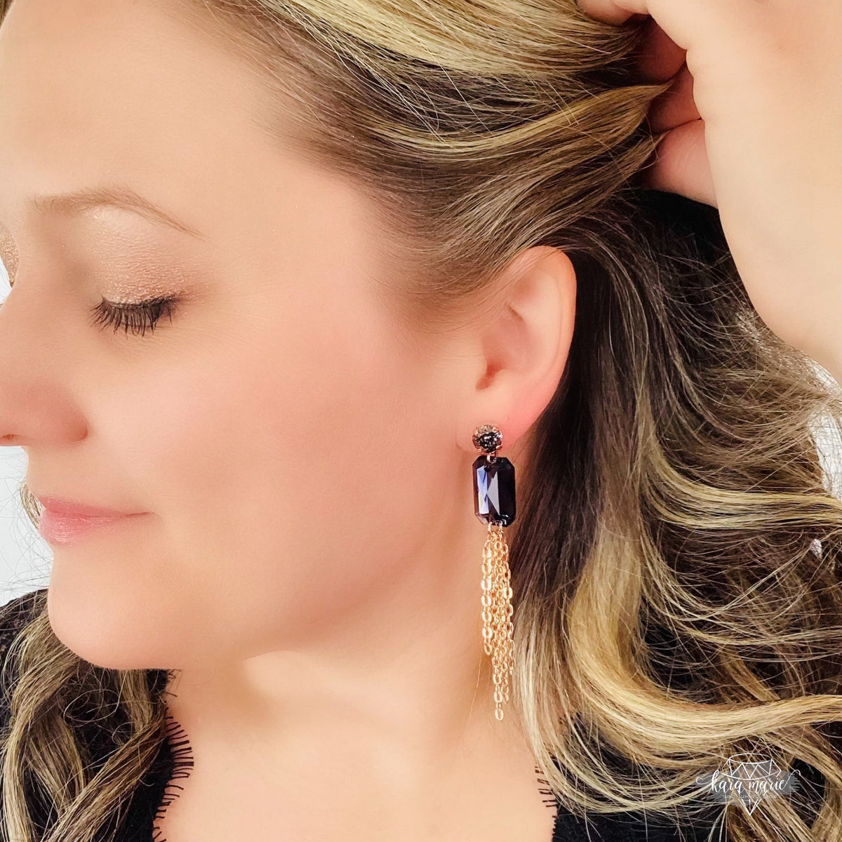 Emerald Cut Rose Gold x Silver Night Tassel Earrings set into Rose Gold Plated Metal with Silver Night Crystals