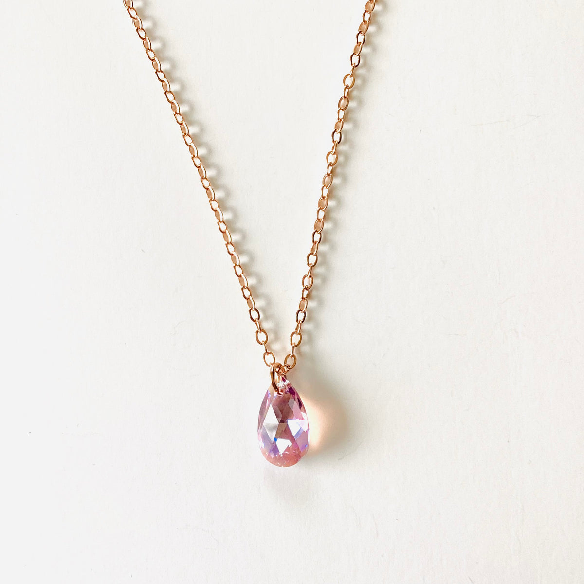 Simple Drop Pendant Necklace in Light Rose Shimmer set into Rose Gold Metal.