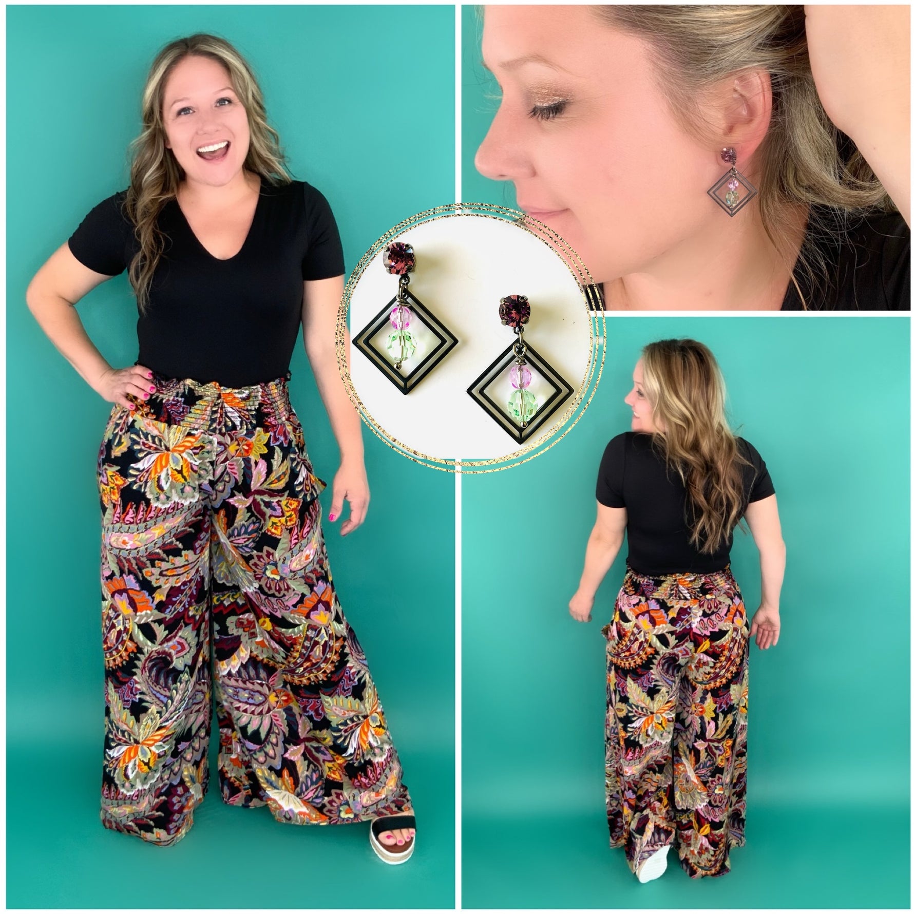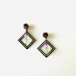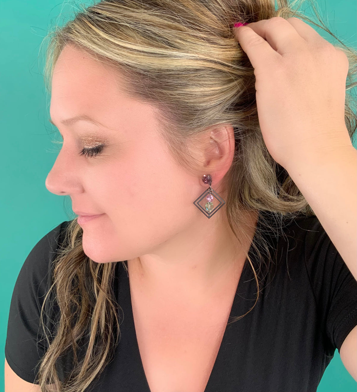 Square Vacay Whitney Earring set into Black Metal with Chrysolite and Rose Crystals Floating in a Square Pendant. Iris Post Crystals.