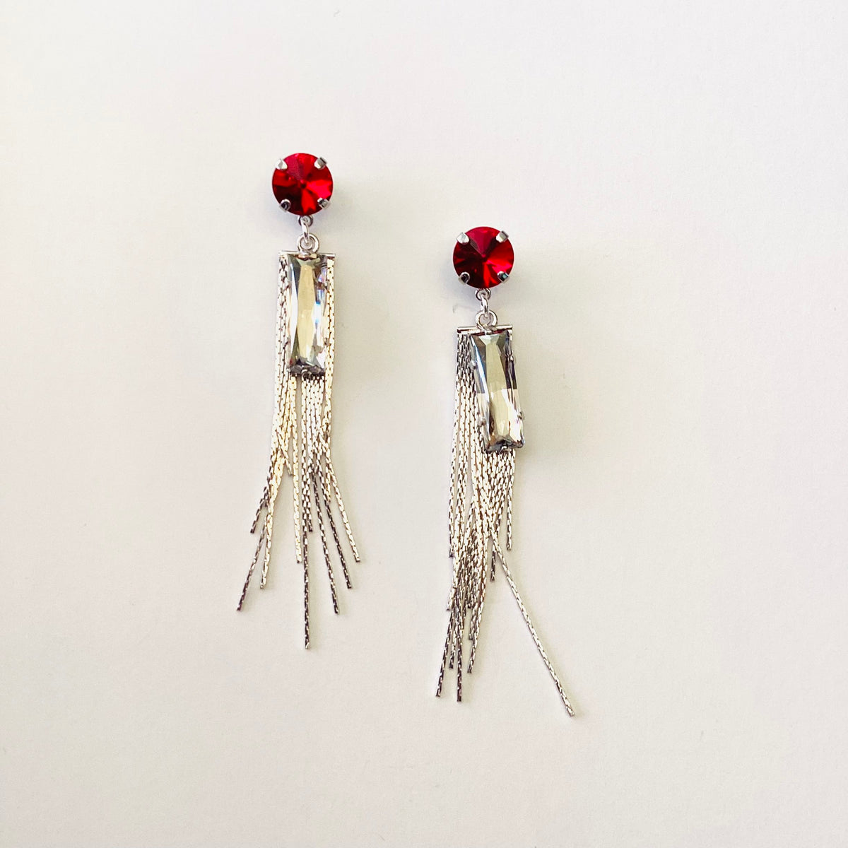 Statement Fringe Earring in Scarlet set into Shiny Silver Metal with Silver Metal Fringe Pendant and Silver Shade Baguette Crystal