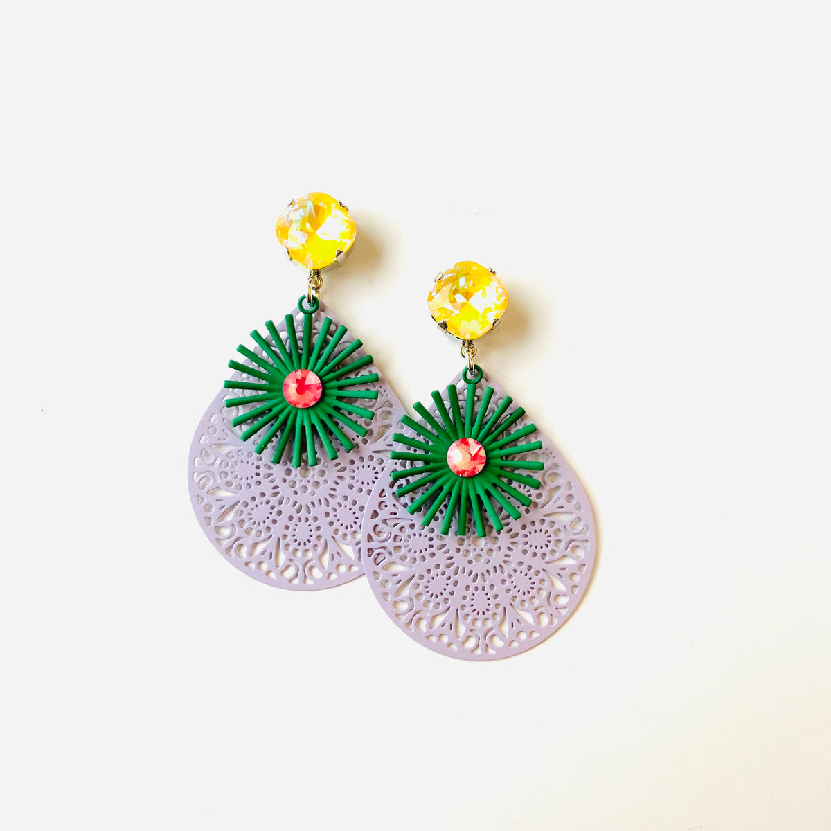 Summer Filigree Teardrop Earrings set into Shiny Silver Metal with Sunshine DeLite Crystals