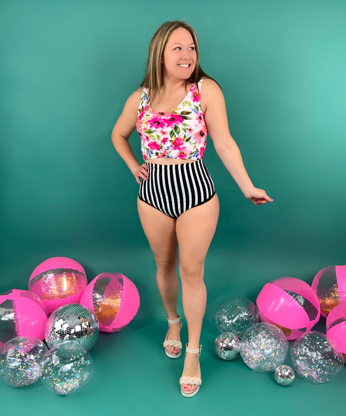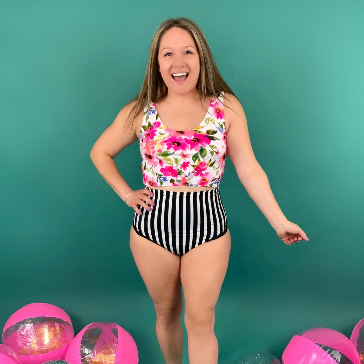This adorable floral midi swim top and striped bottoms are perfect for a hot, sunny day. The top features a scoop neckline on the front and back, is fully lined with removable cups, and has a knotted front.