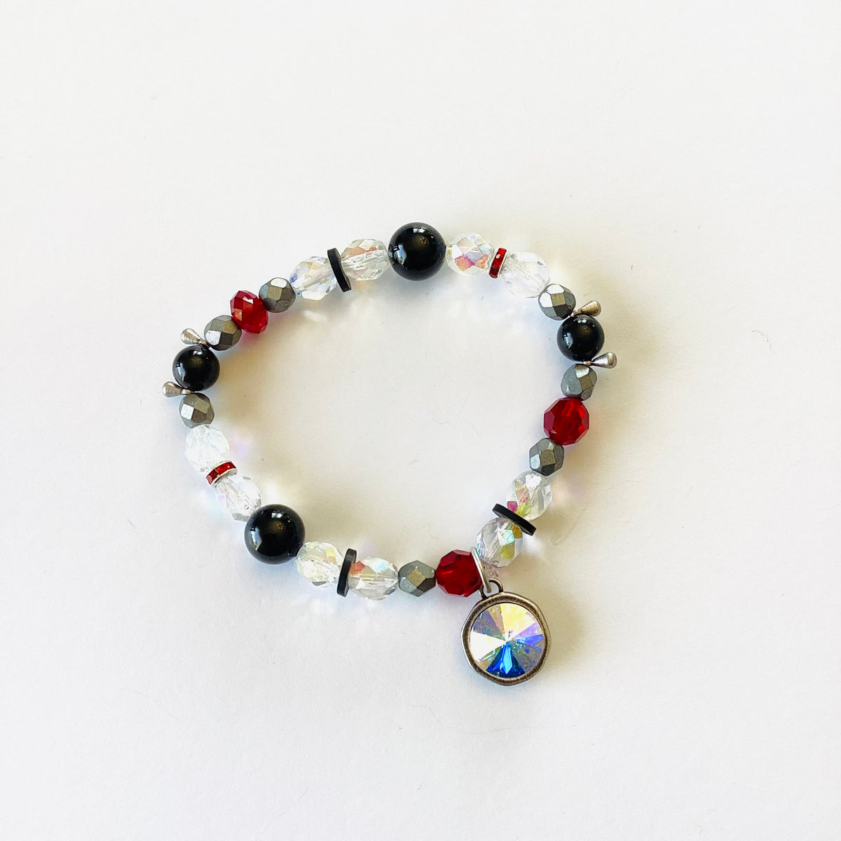 Sweet Scarlet Beaded Stretch Bracelet with pops of Siam, Black Pearl, and Crystal AB Fire Polished Beads