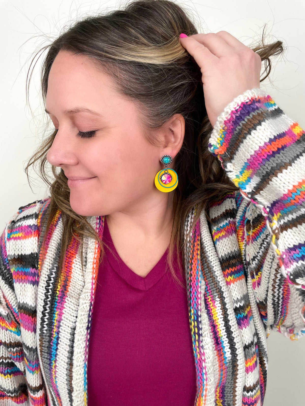 Time After Time Earrings set into Antique Silver Metal with Yellow Matte Metal Pendant, Teal Ring, and Ultra Pink Lacquer AB and Laguna Crystals.