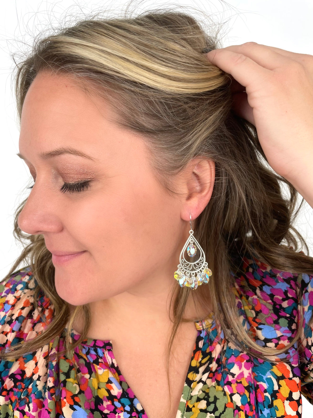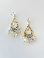 Timeless Treasure Earrings set into Shiny Silver Metal with Filigree Pendant and Crystal Shimmer Crystals.