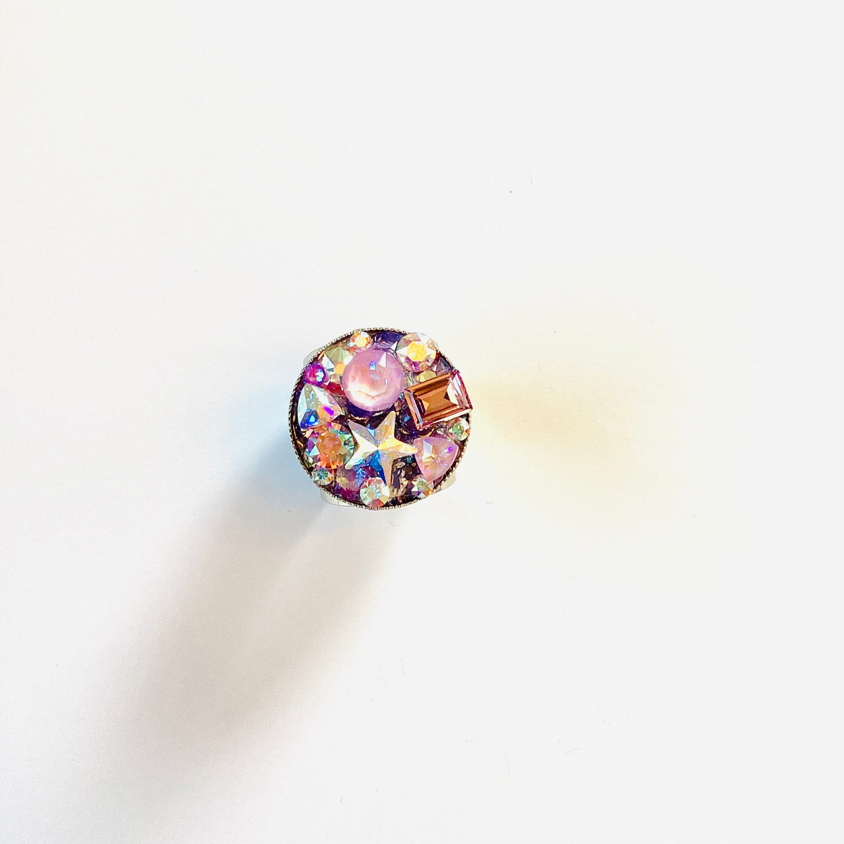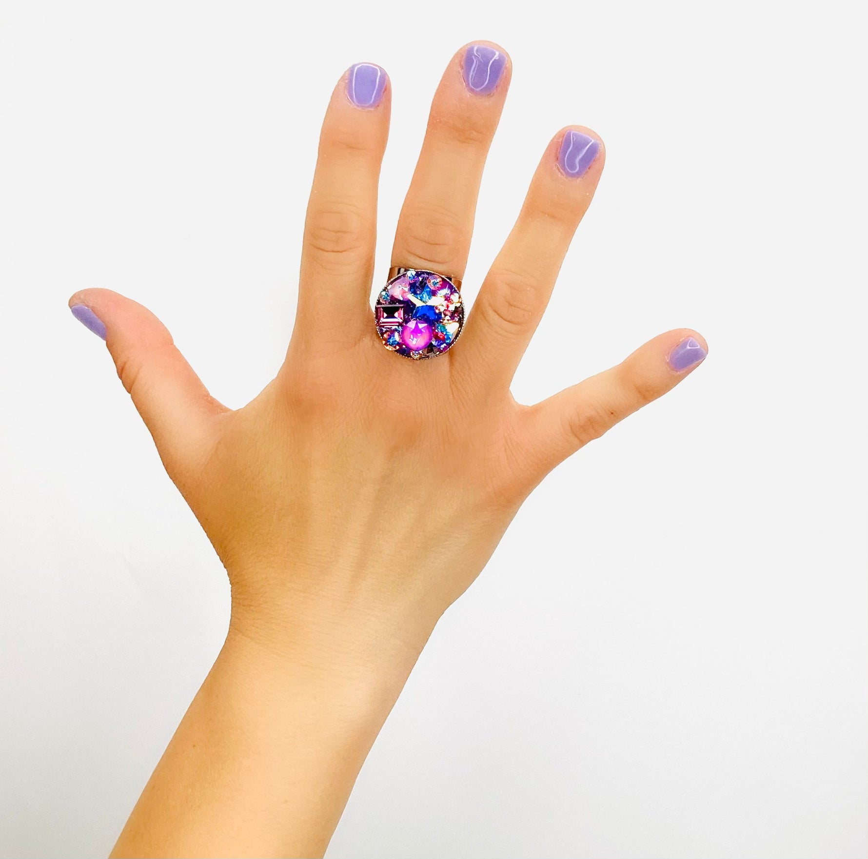 Treasure Chest Round Ring in Purple Hues set into Shiny Silver Metal.