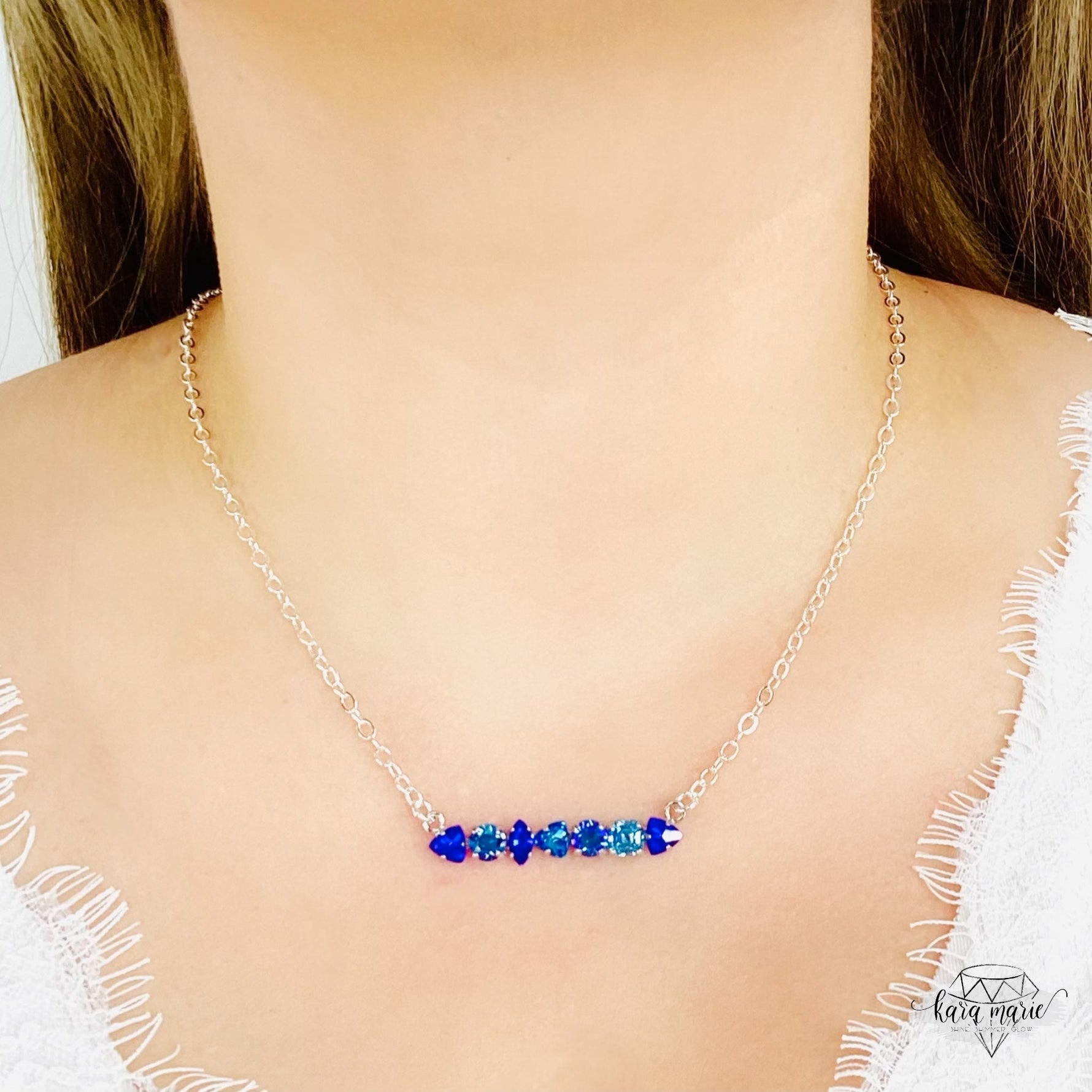 Tribal Sticks Bar Necklace in Blue Hues set into Silver Plated Metal.