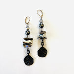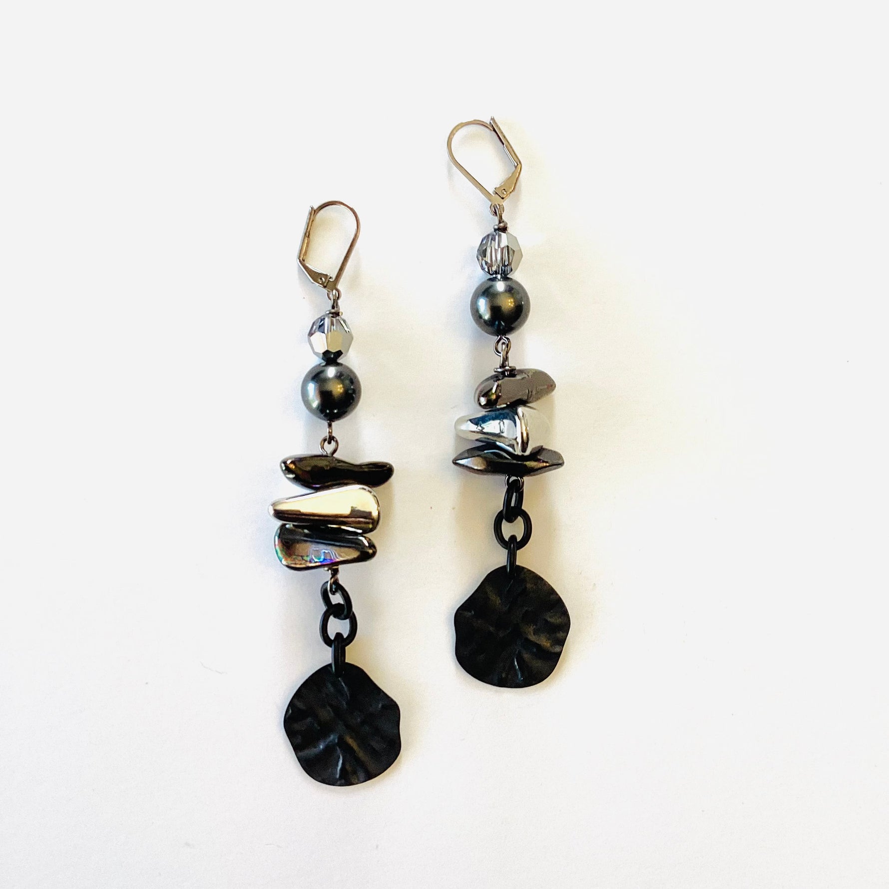 Tribal Stones Long Drop Earrings set into Black Metal with Silver Night Crystals and Black Pearls. Organic Shaped Lightweight Beads and Crushed Metal Pendant