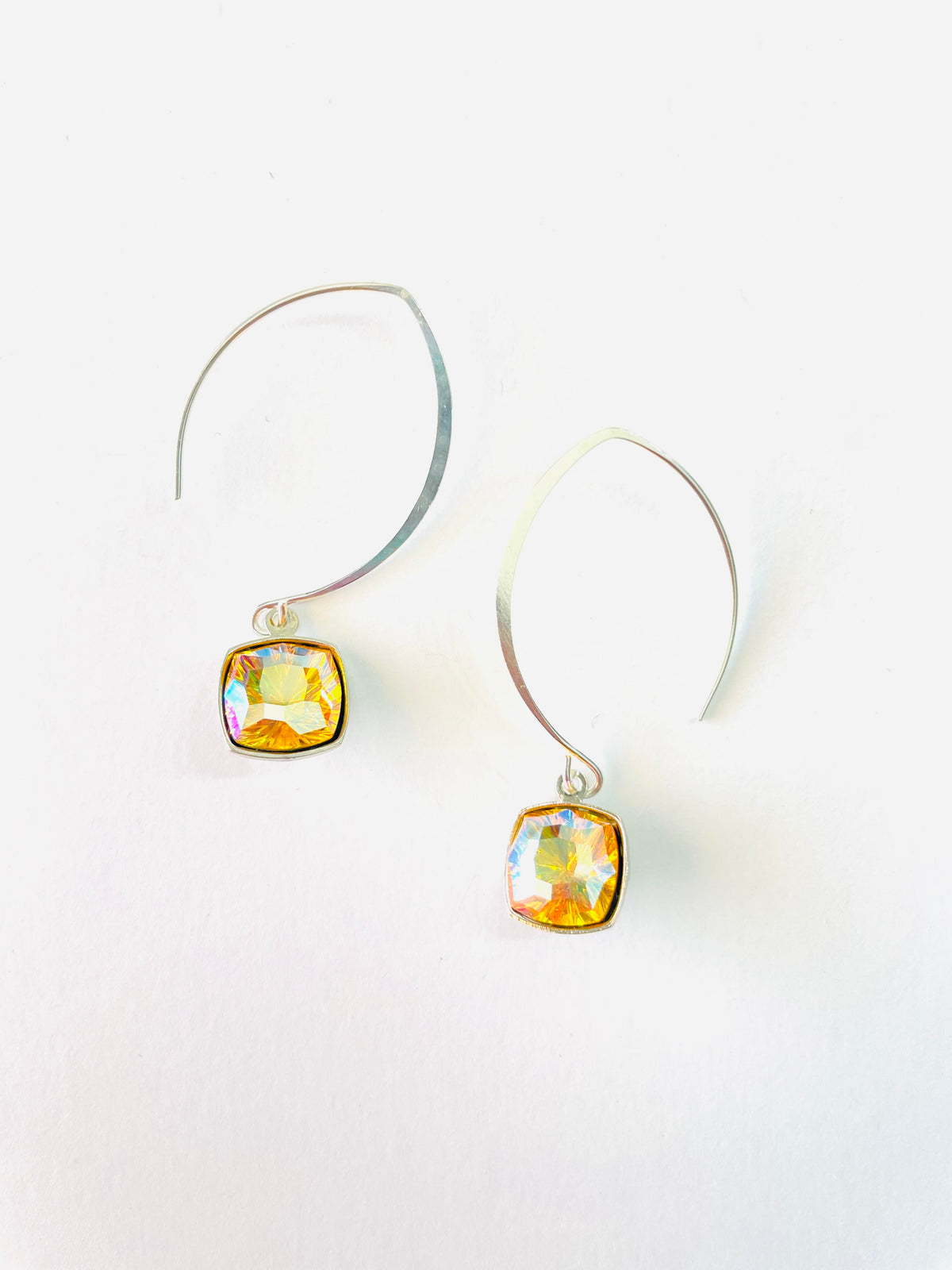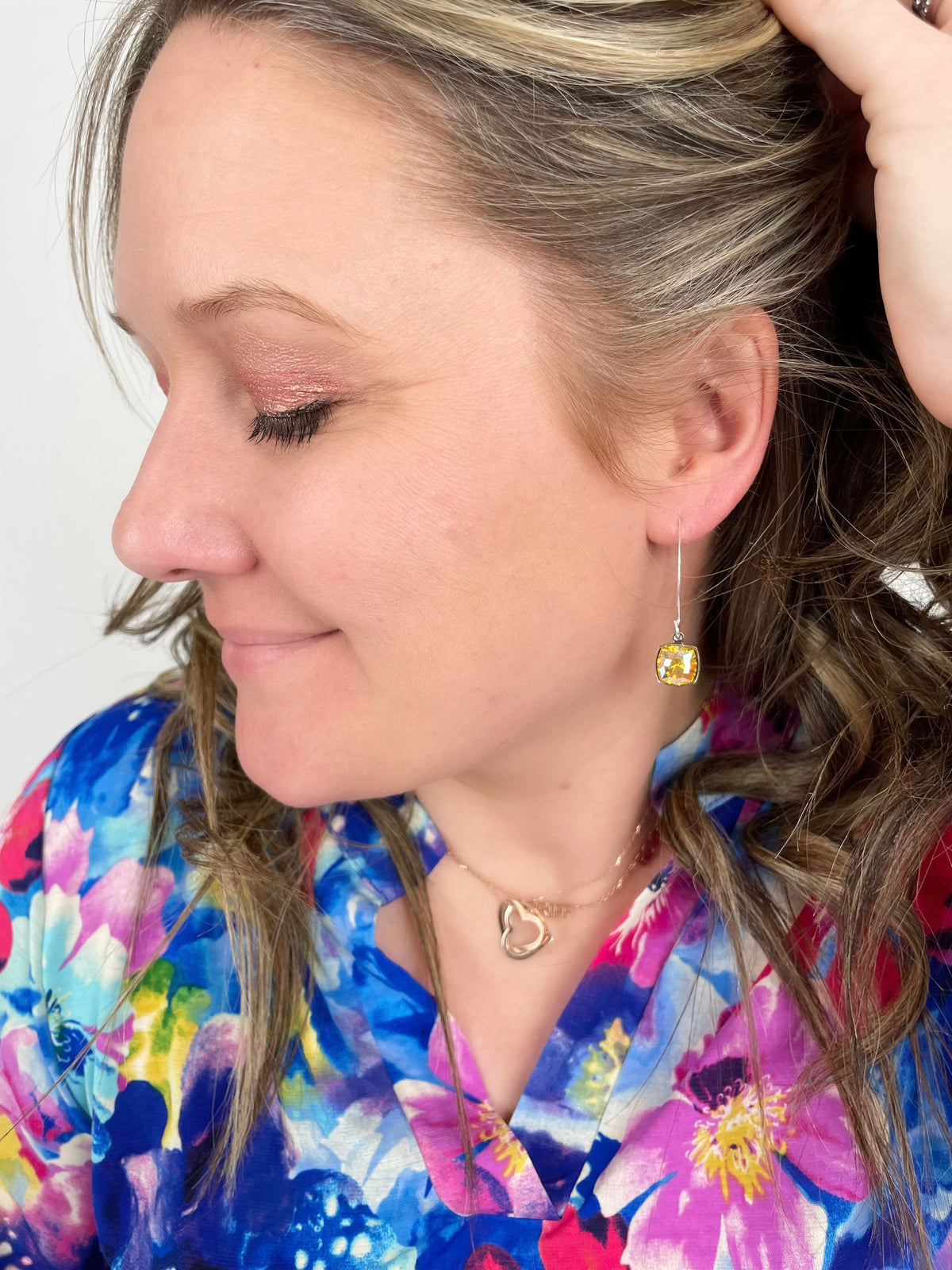 Tropical Topaz Drop Earrings set into Shiny Silver Metal with Topaz AB Crystals