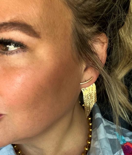 These Vegas Fringe Earrings add sophisticated style to your look. Crafted with simple designs in front and unique, intricate fringe behind the ear, they add a touch of elegance to any outfit. The lightweight design ensures comfort throughout your day.