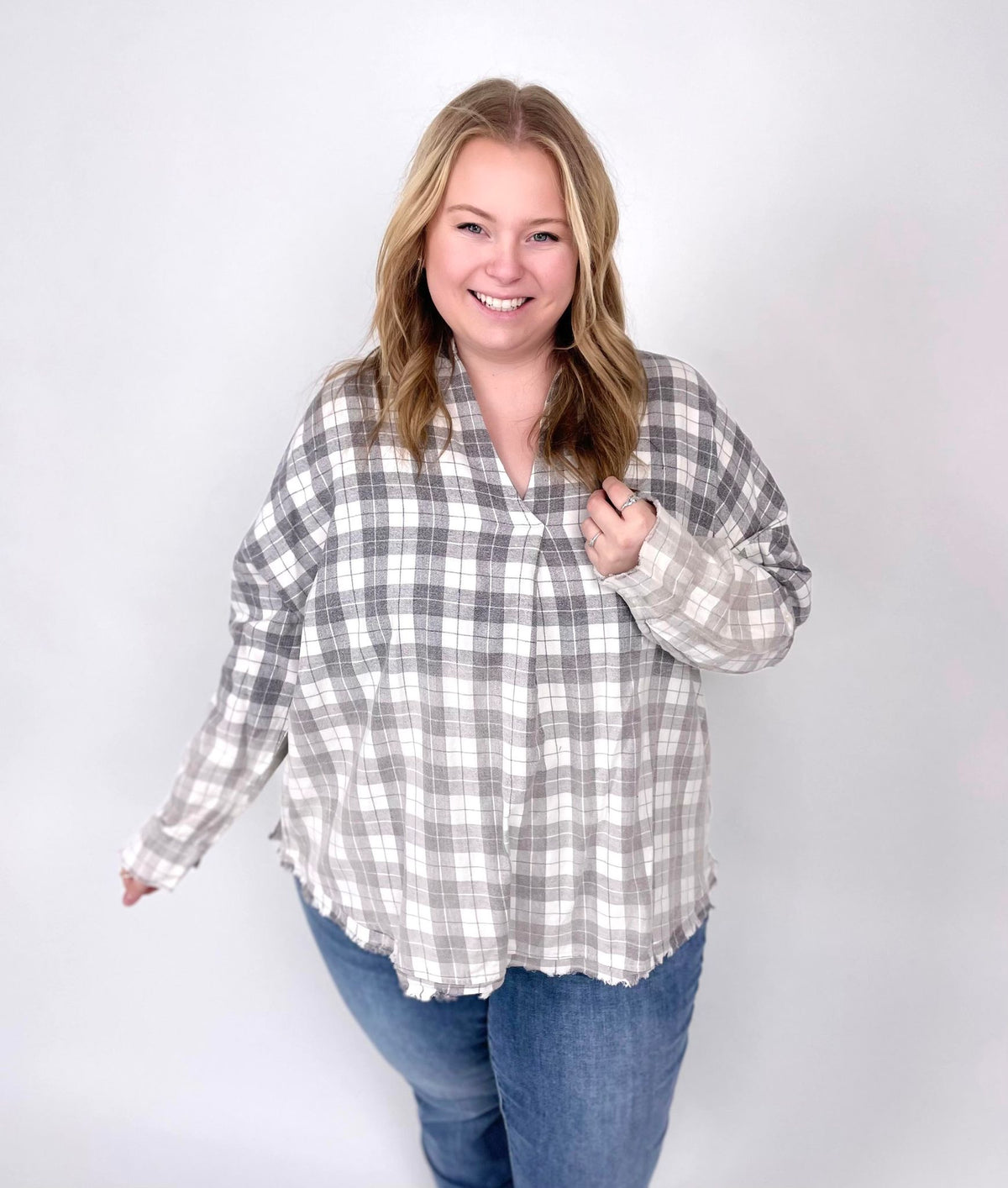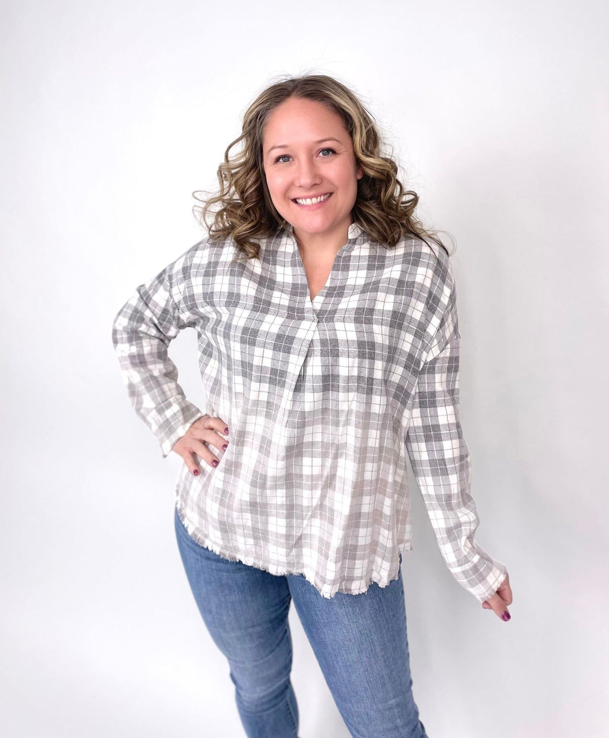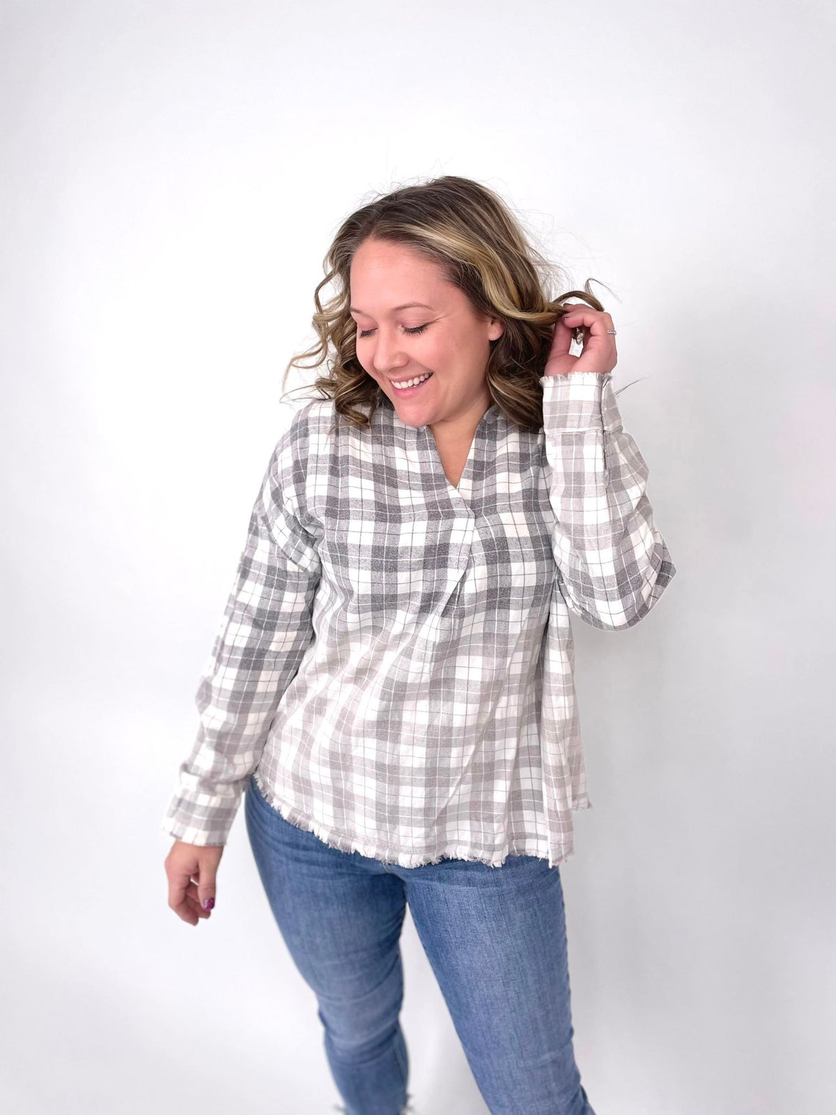 Get all those vintage feels with this long sleeve top! It features a collared v-neckline, a plated center front, and a plaid design with an ombre dip-dyed effect! The frayed hemline on the sleeves and body adds just the right touch to bring it all together! Pair this top with jeans and boots for an everyday cozy and casual style!