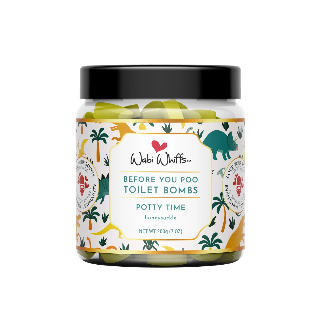Potty Time (Honeysuckle) Honeysuckle, the perfect blend of sweet honey and summer flowers that transport you to a carefree fragrance experience. Contains yellow fizzing hearts with gold biodegradable glitter.