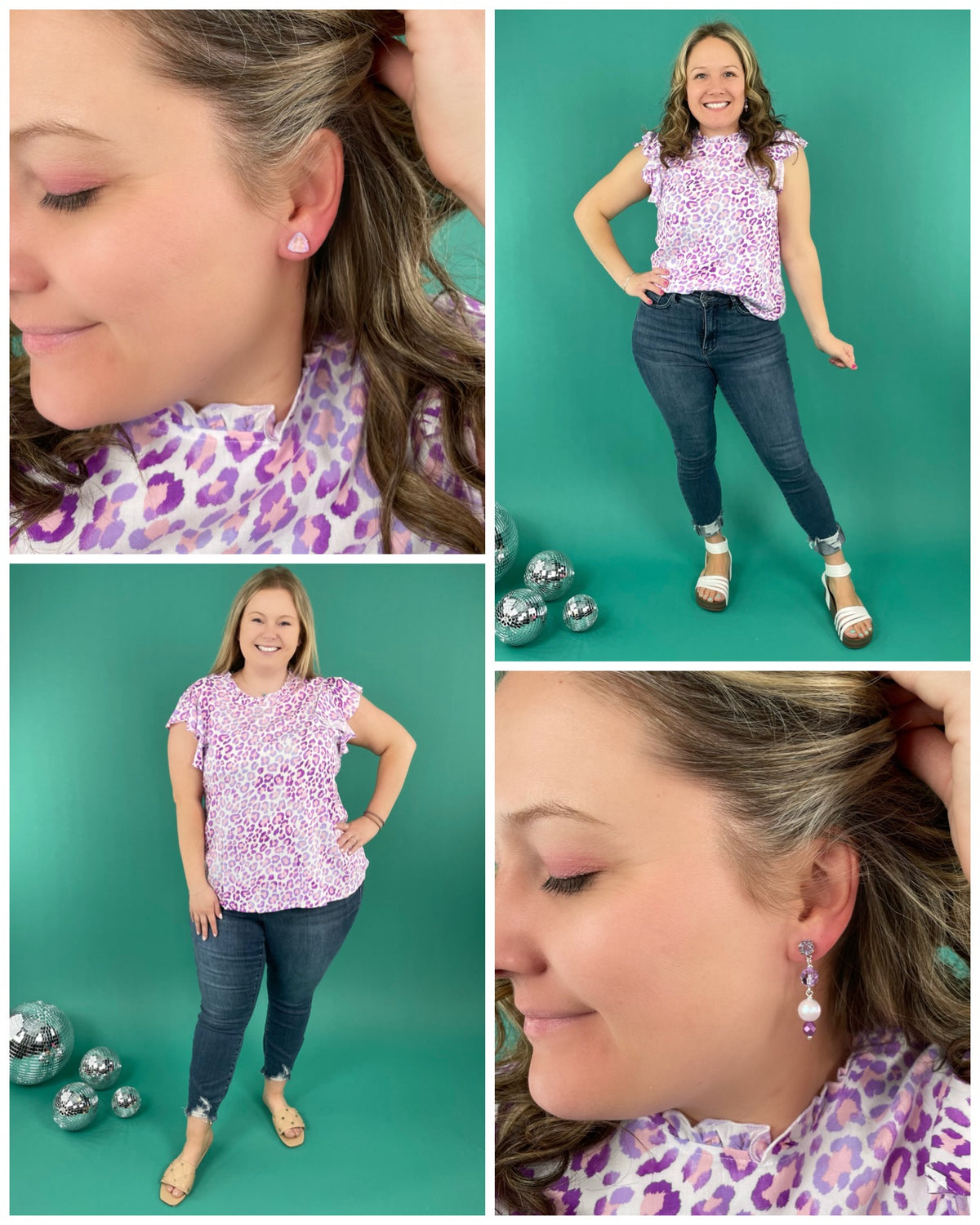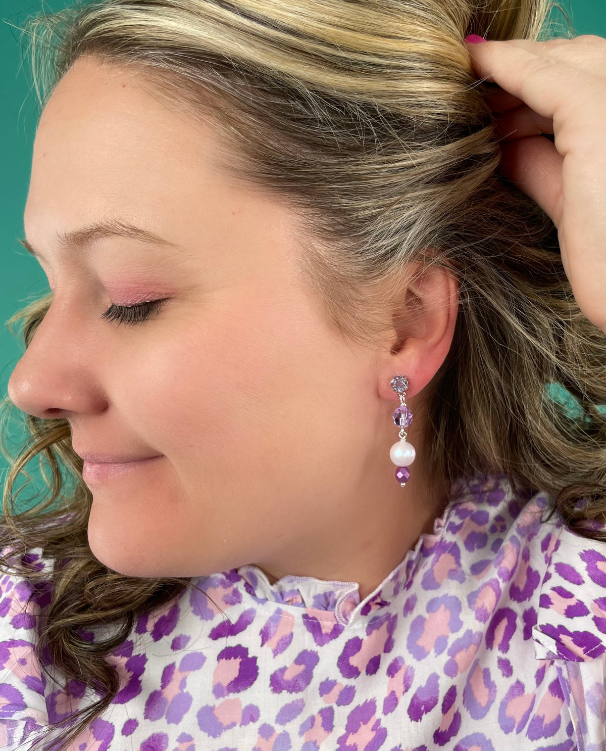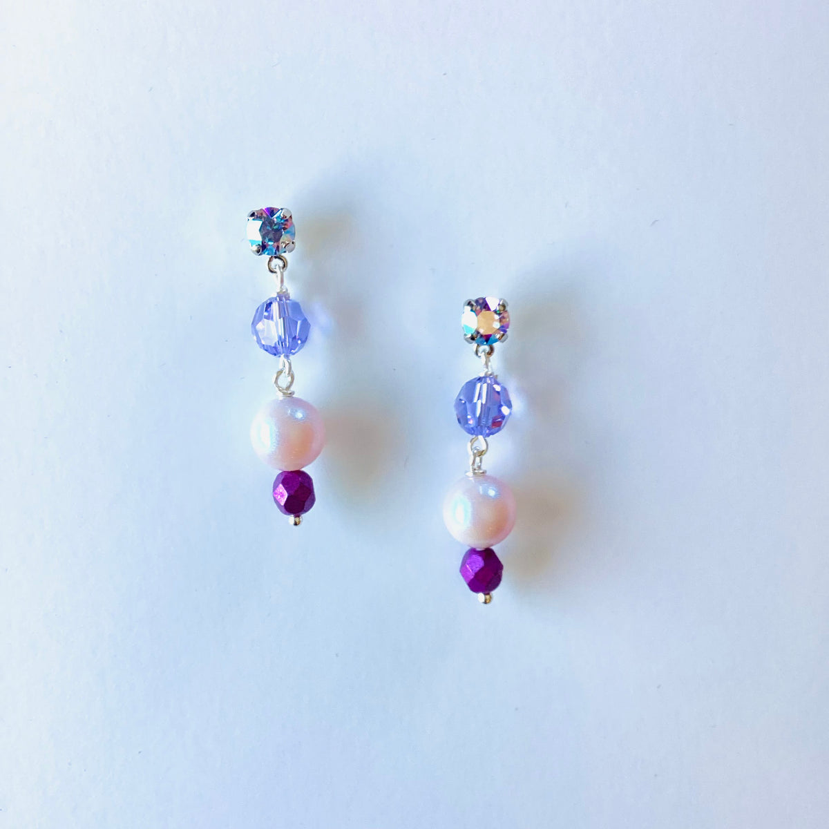 Wild Violet Drop Earrings set into Shiny Silver Metal with Violet AB, Violet, and Iridescent White Pearls.