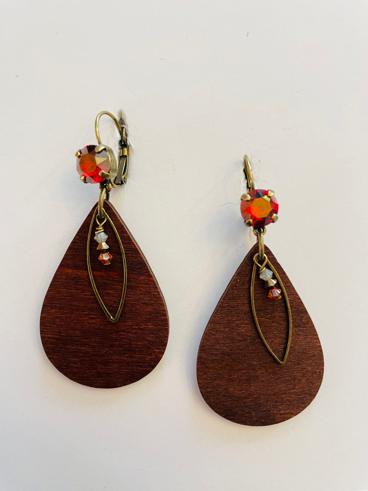 Wood Teardrop Charm Earrings featuring Scarlet Champagne set into Antique Brass Metal