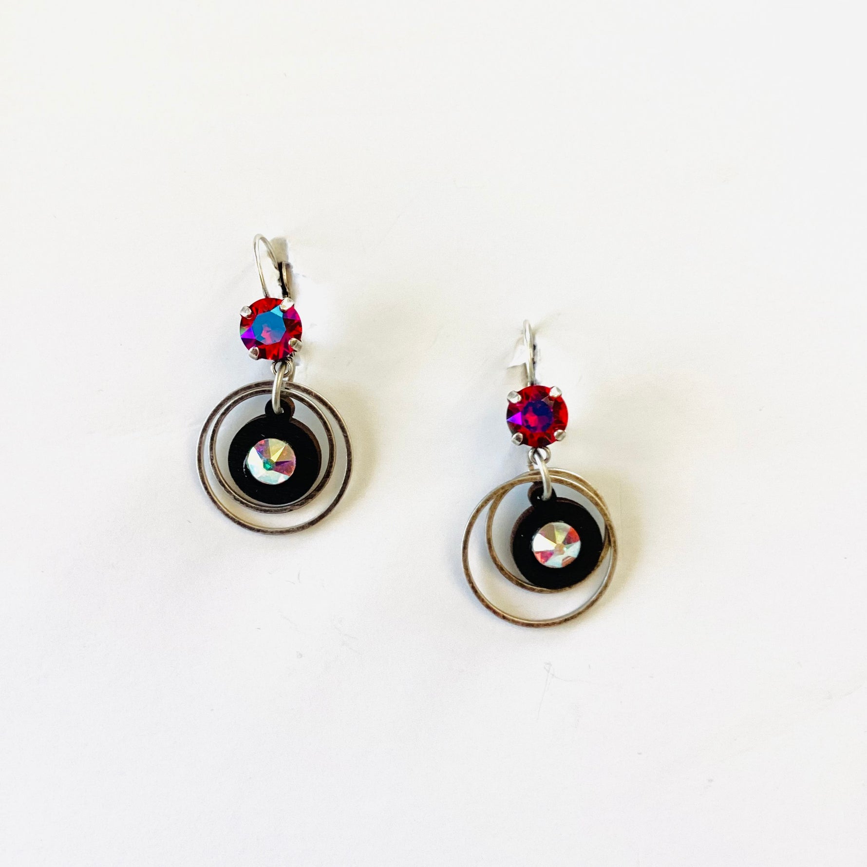 Wood Wonder Drop Earrings in Scarlet Glacier Blue set into Antique Silver Metal with Lightweight Black Wood Floating Pendant and Crystal AB