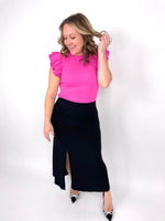 Slinky Feel Material. Stretchy. Side Slit Midi Pencil Skirt with Folding Yoga Waistband.