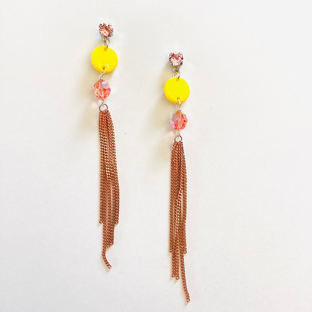 Your Favorite Chain Fringe Earrings set into Shiny Silver Metal with Rose Peach, Yellow Resin Pendant and Peach Chain Fringe